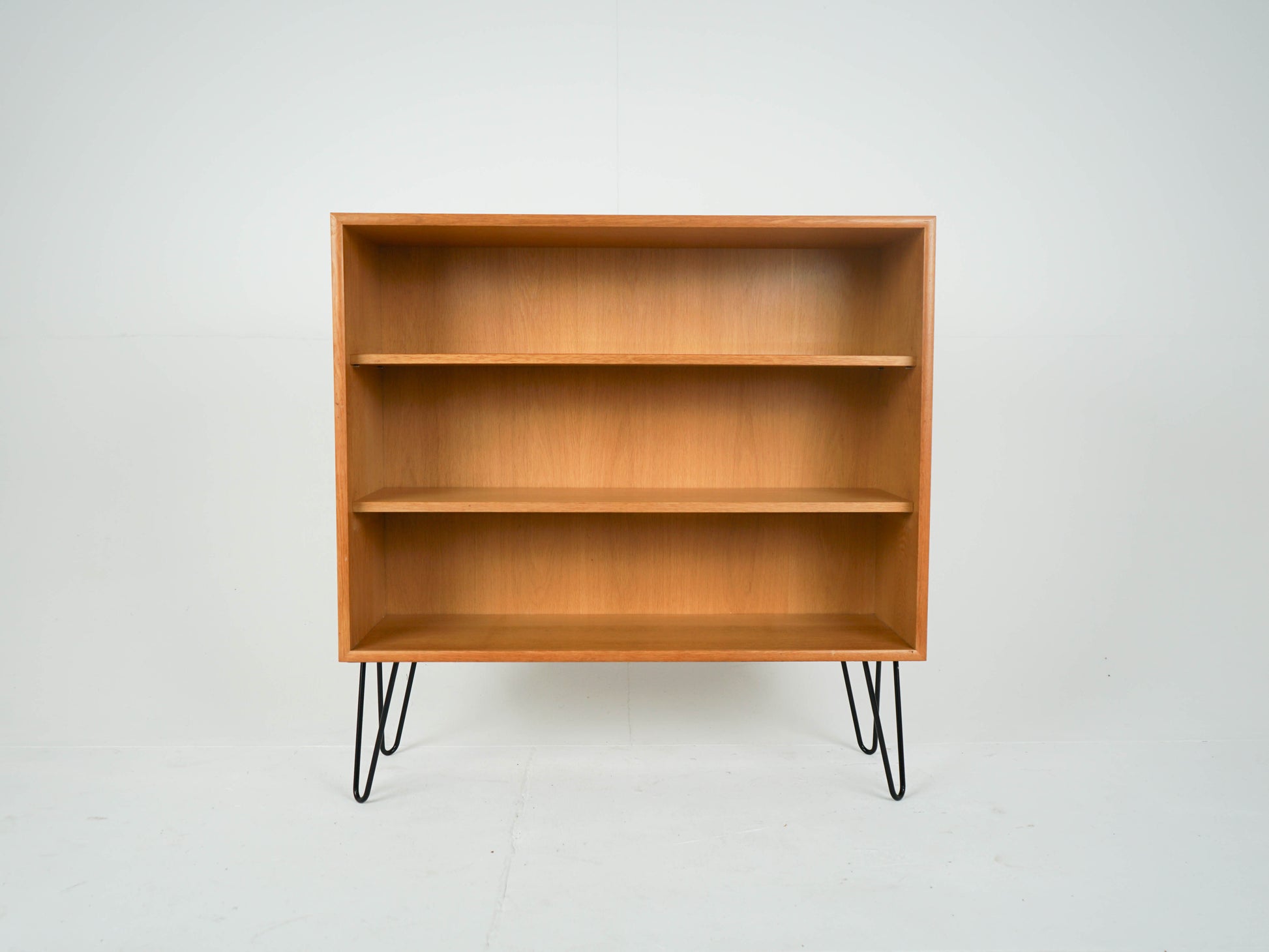 Zum Verkauf steht ein wunderschönes Eichen Bücherregal mit zwei verstellbaren Einlegeböden in einem super Vintage Zustand auf schwarzen Hairpins.