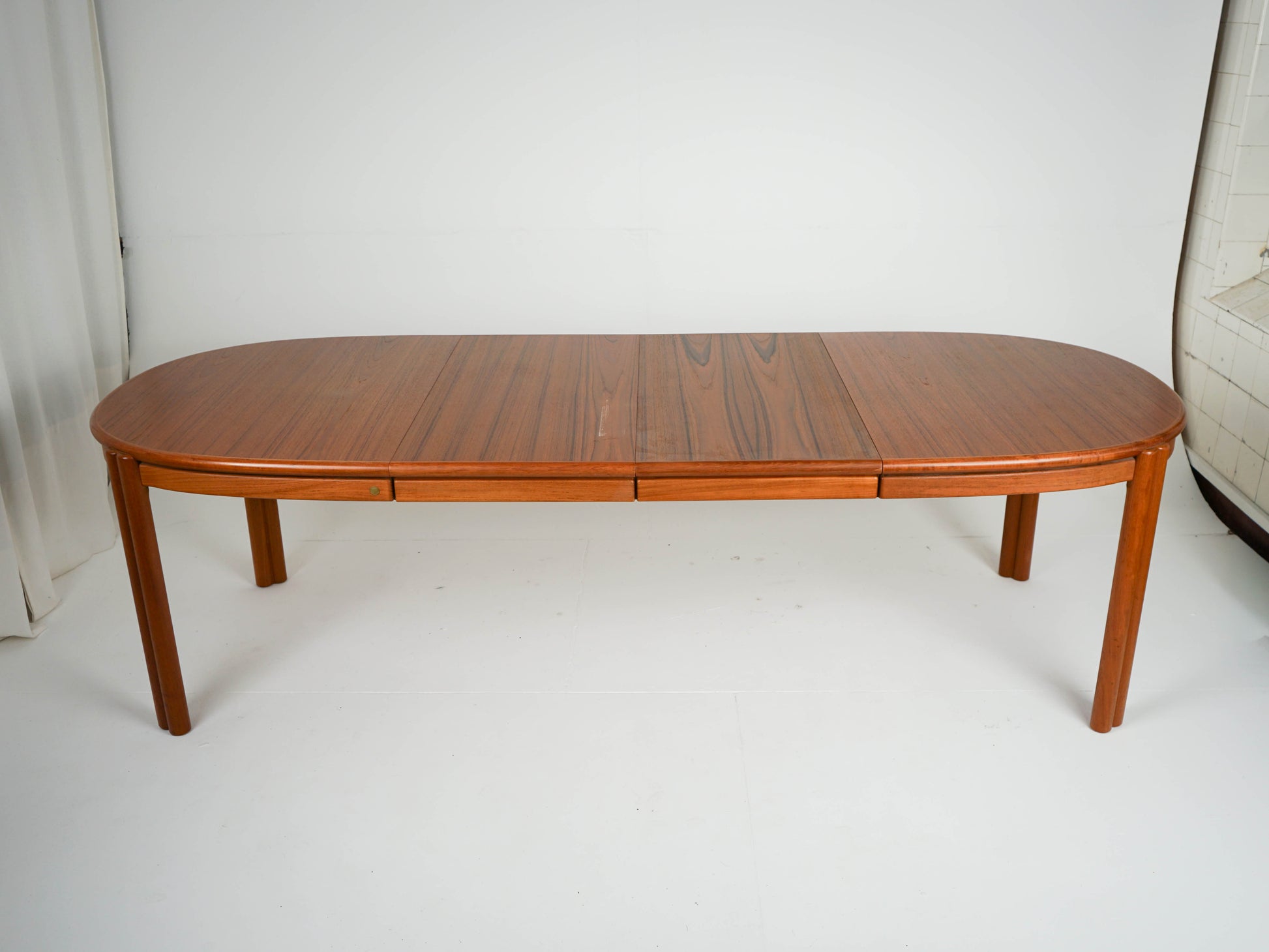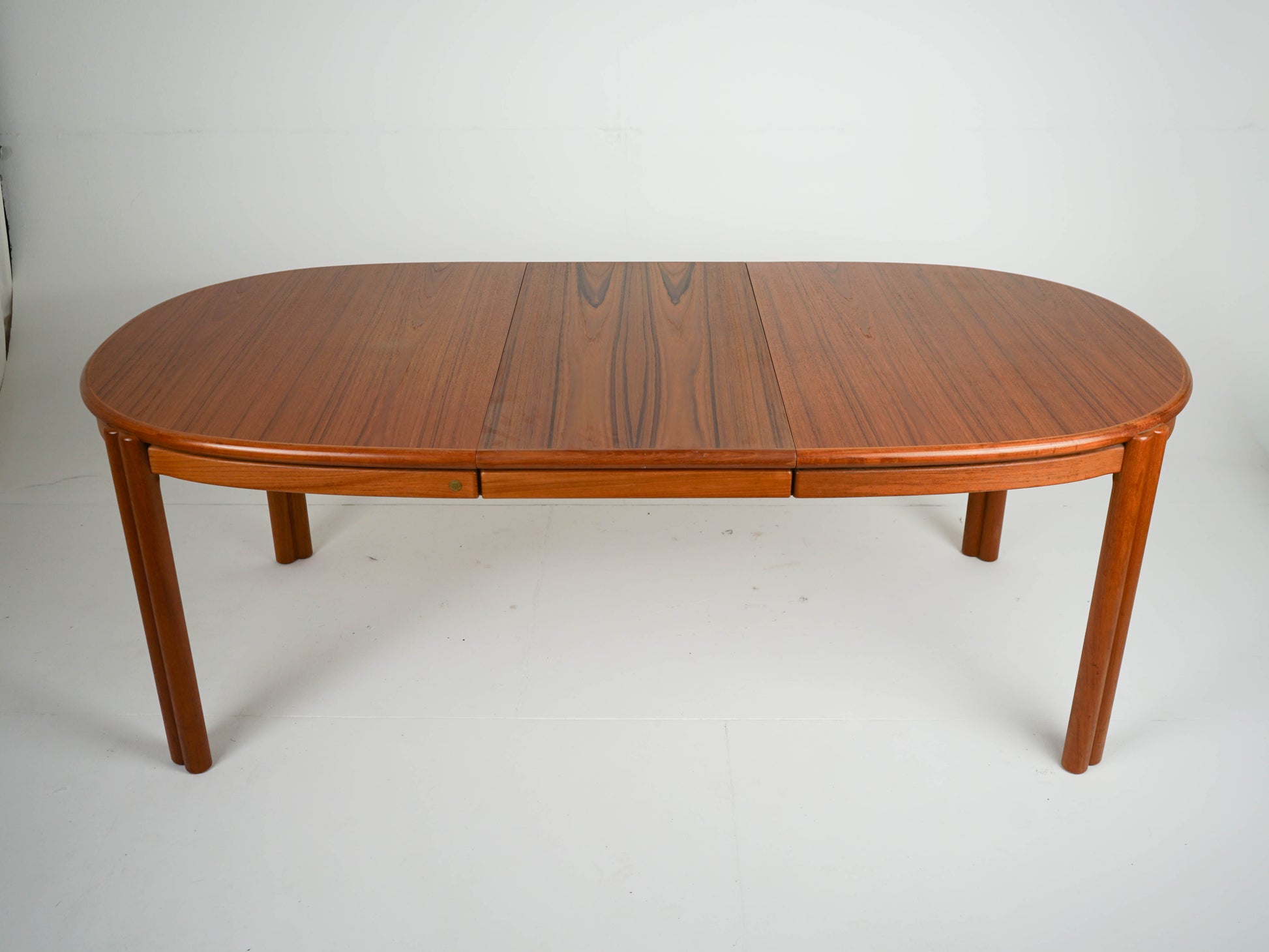 Zum Verkauf steht ein wunderschöner dänischer Teak Esstisch mit zwei Erweiterungen in einem traumhaften Vintage Zustand.
