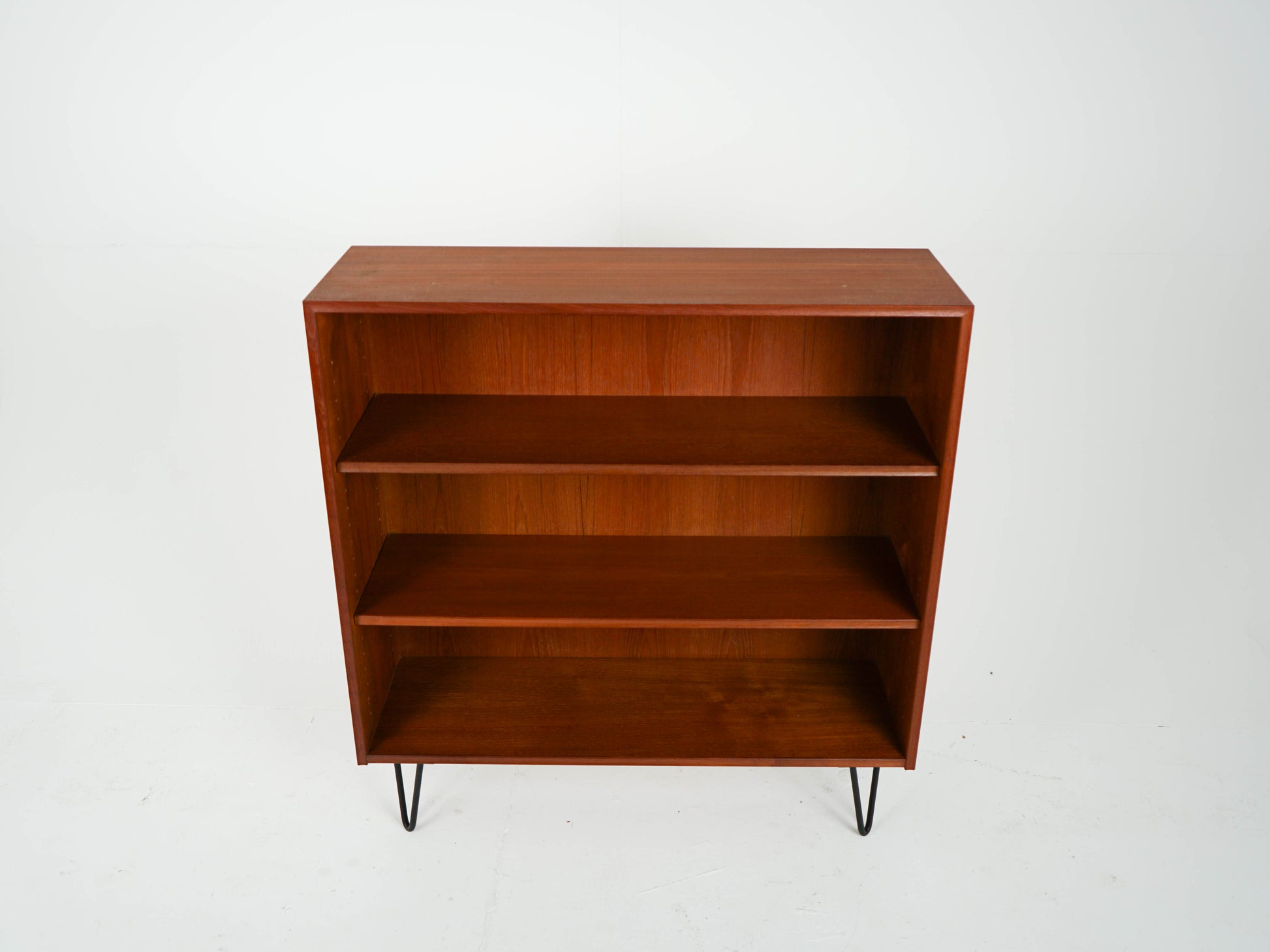 Zum Verkauf steht ein wunderschönes dänisches Teak Regal mit zwei verstellbaren Regalböden auf schwarzen Hairpinbeinen in einem traumhaften Vintage Zustand.
