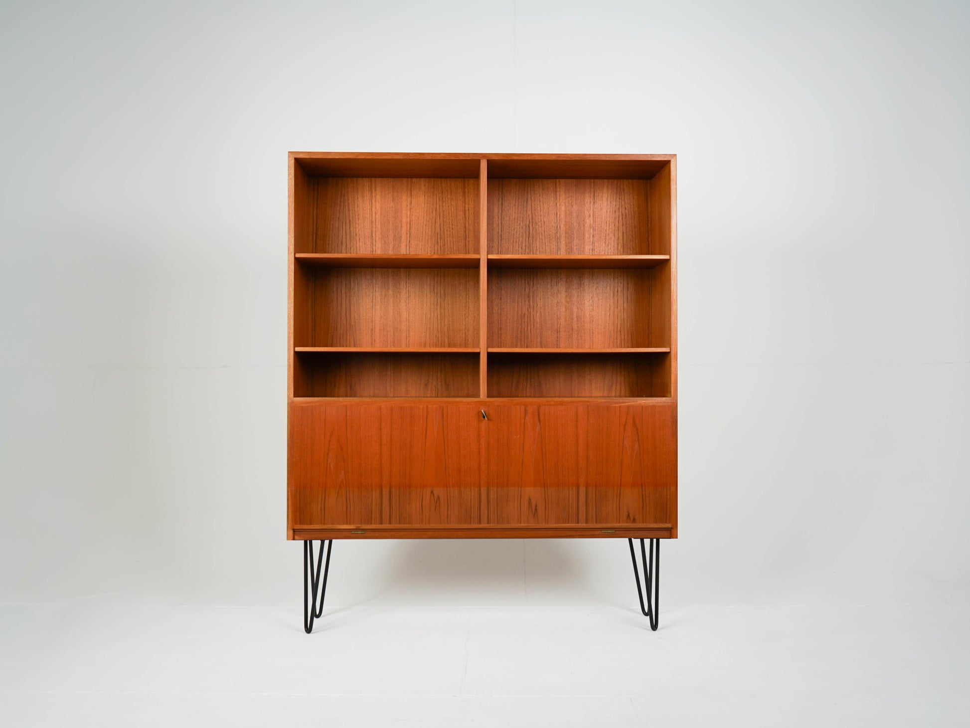 Zum Verkauf steht ein wunderschöner Teak Schrank mit Einer großen Klappe, sechs verstellbaren Einlegeböden und sieben Schubladen von Omann Jun in einem traumhaften Vintage Zustand auf Metallbeinen.