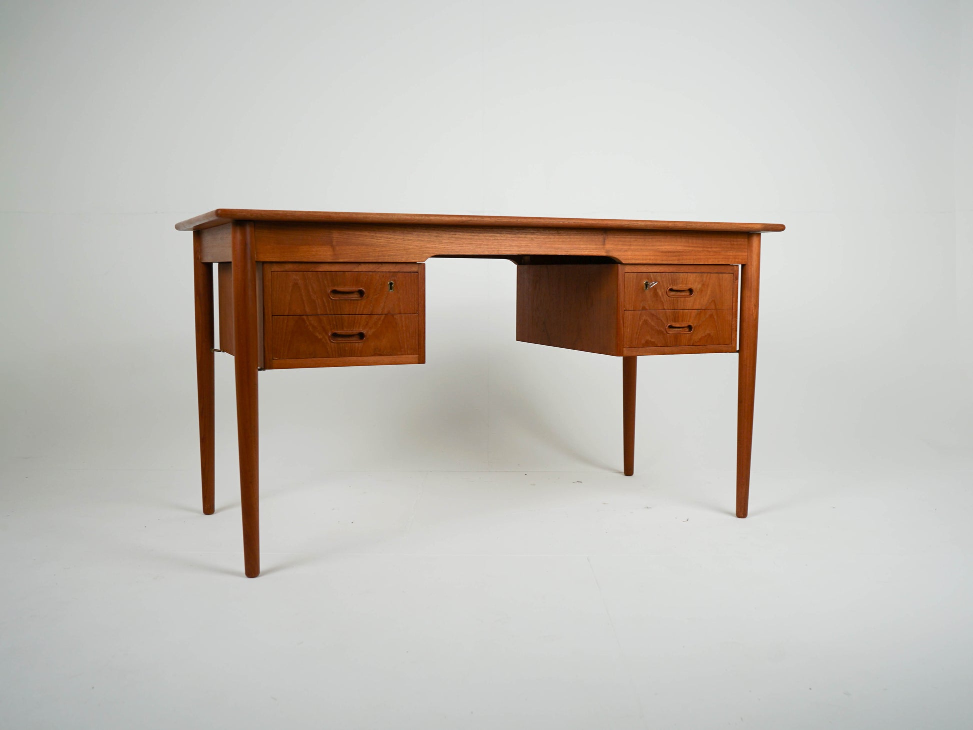 Zum Verkauf steht ein wunderschöner Teak Schreibtisch mit vier geräumigen Schubladen. Die jeweils oben liegenden Schubladen sind mit dem selben Schlüssel abschließbar. Der Schreibtisch wurde frisch geschliffen und geölt.