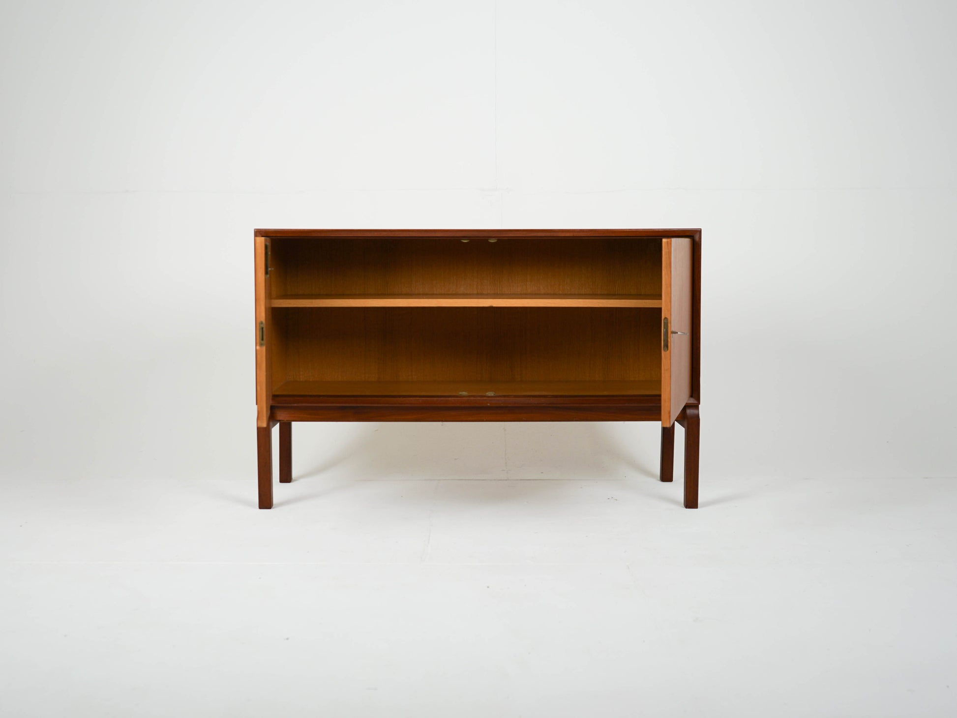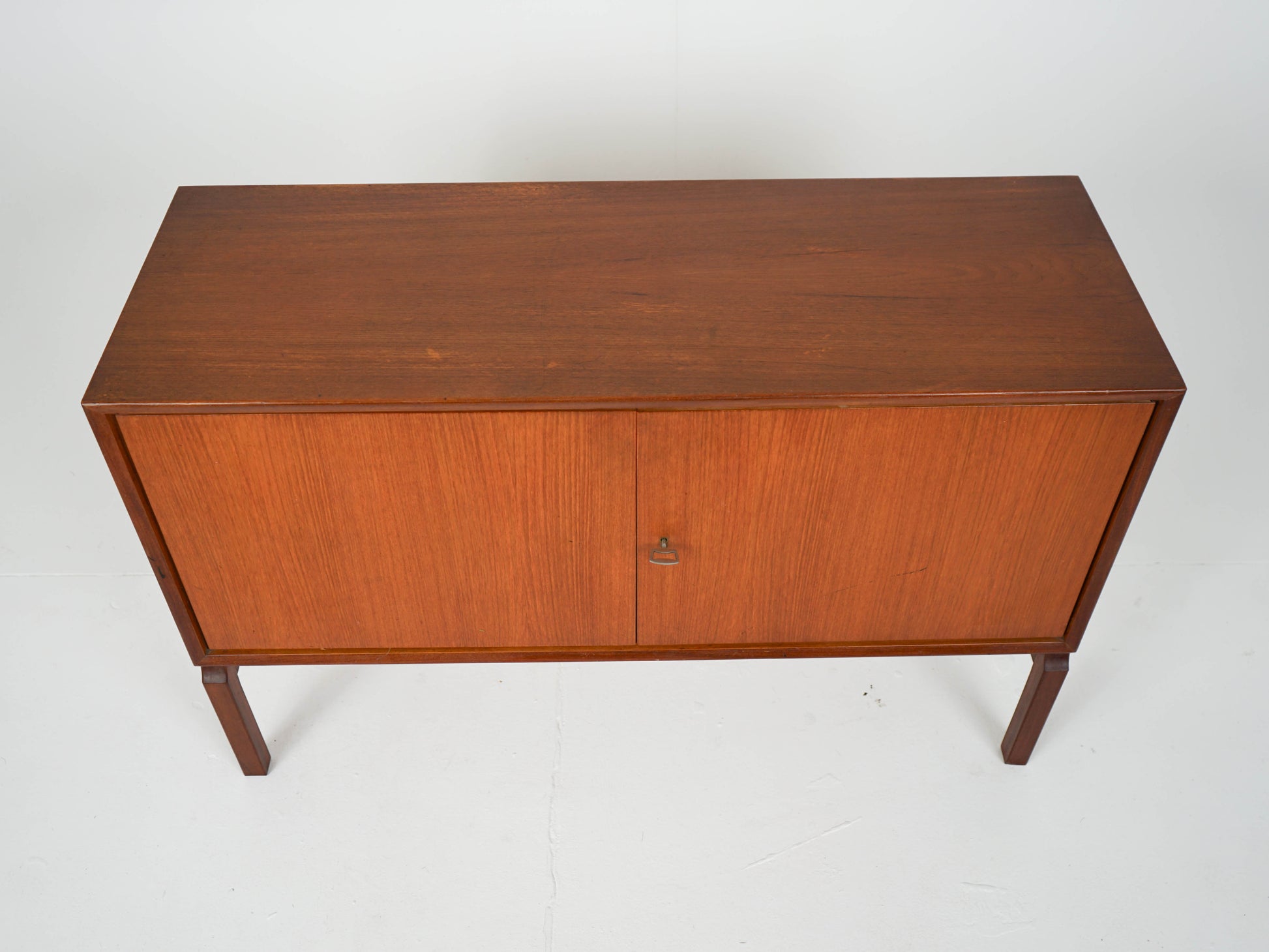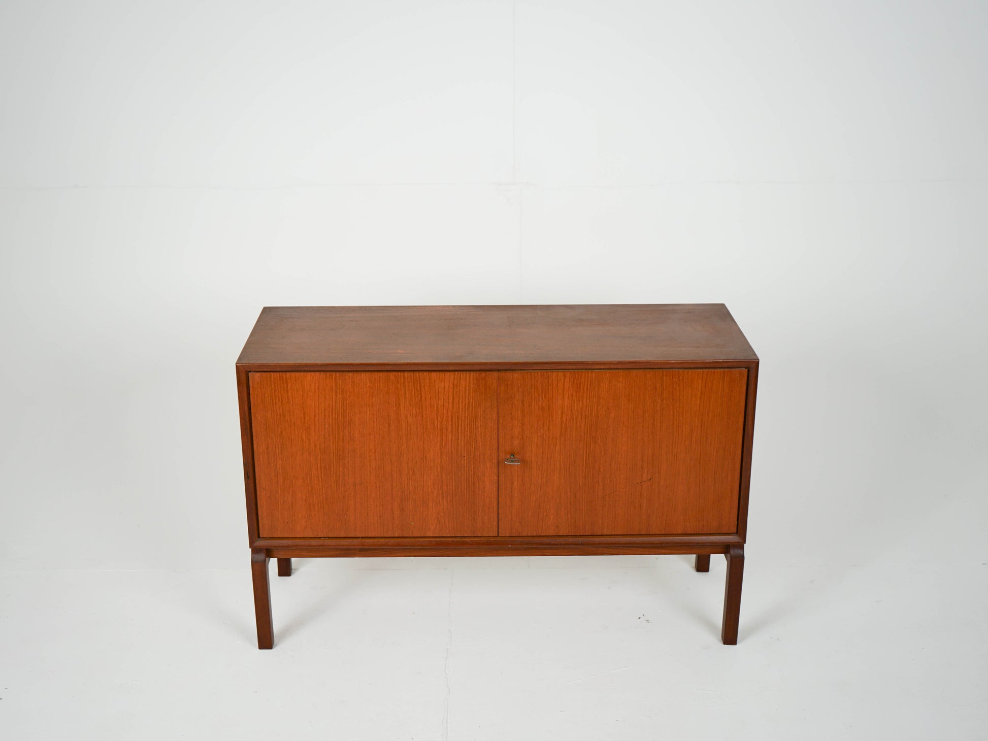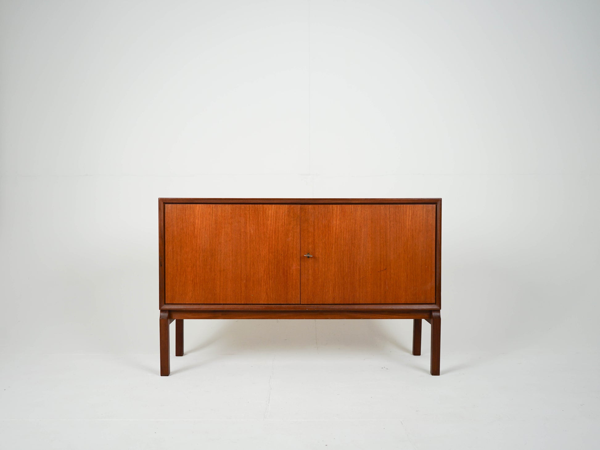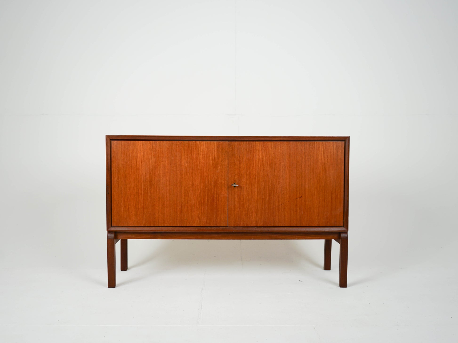 Zum Verkauf steht ein wunderschönes Teak Sideboard mit einem verstellbaren Einlegeboden und zwei abschließbaren Schranktüren in einem traumhaften Vintage Zustand auf einem Holzgestell.