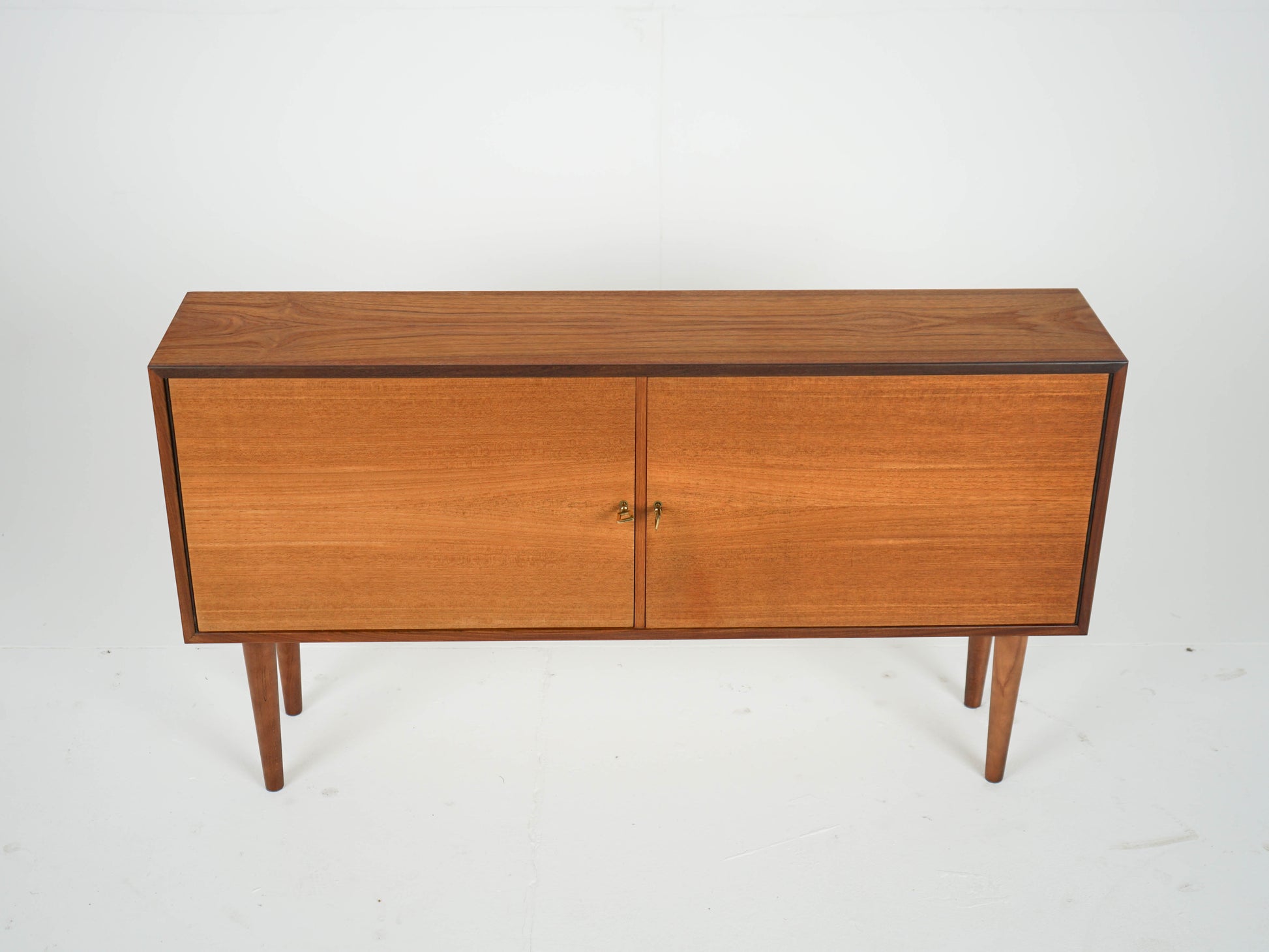 Zum Verkauf steht ein wunderschönes dänisches Teak Sideboard mit zwei abschließbaren Schranktüren in einem super Vintage Zustand auf Holzbeinen.