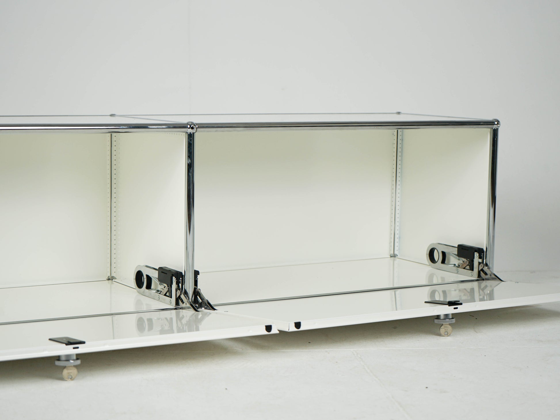 Zum Verkauf steht ein wunderschönes abschließbares used USM Regal in der Farbe Reinweiß RAL 9010 in einem super Zustand mit Soft-Close-Scharnieren.
