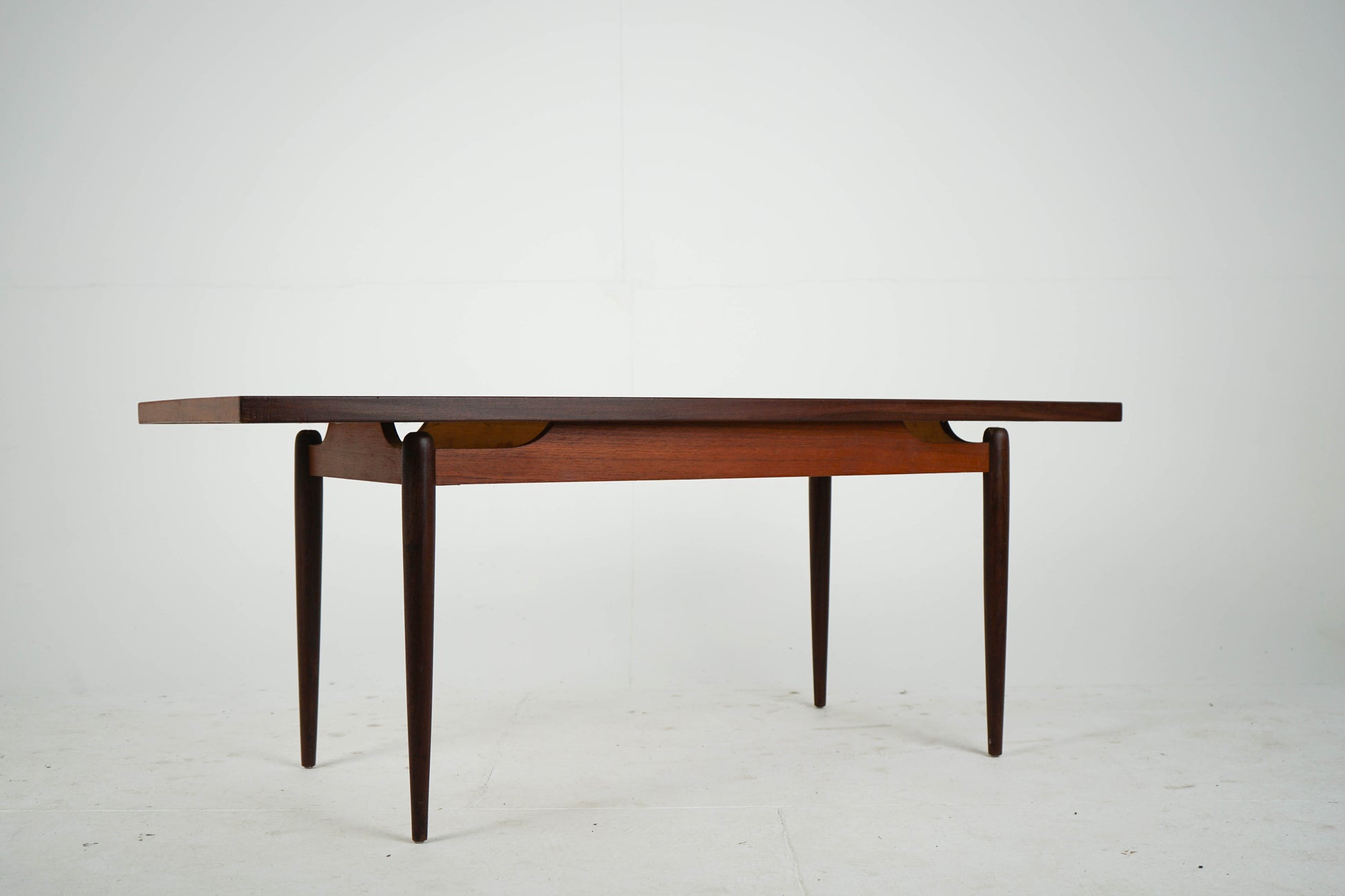 Zum Verkauf steht ein wunderschöner Vintage Teak Couchtisch auf Holzbeinen.