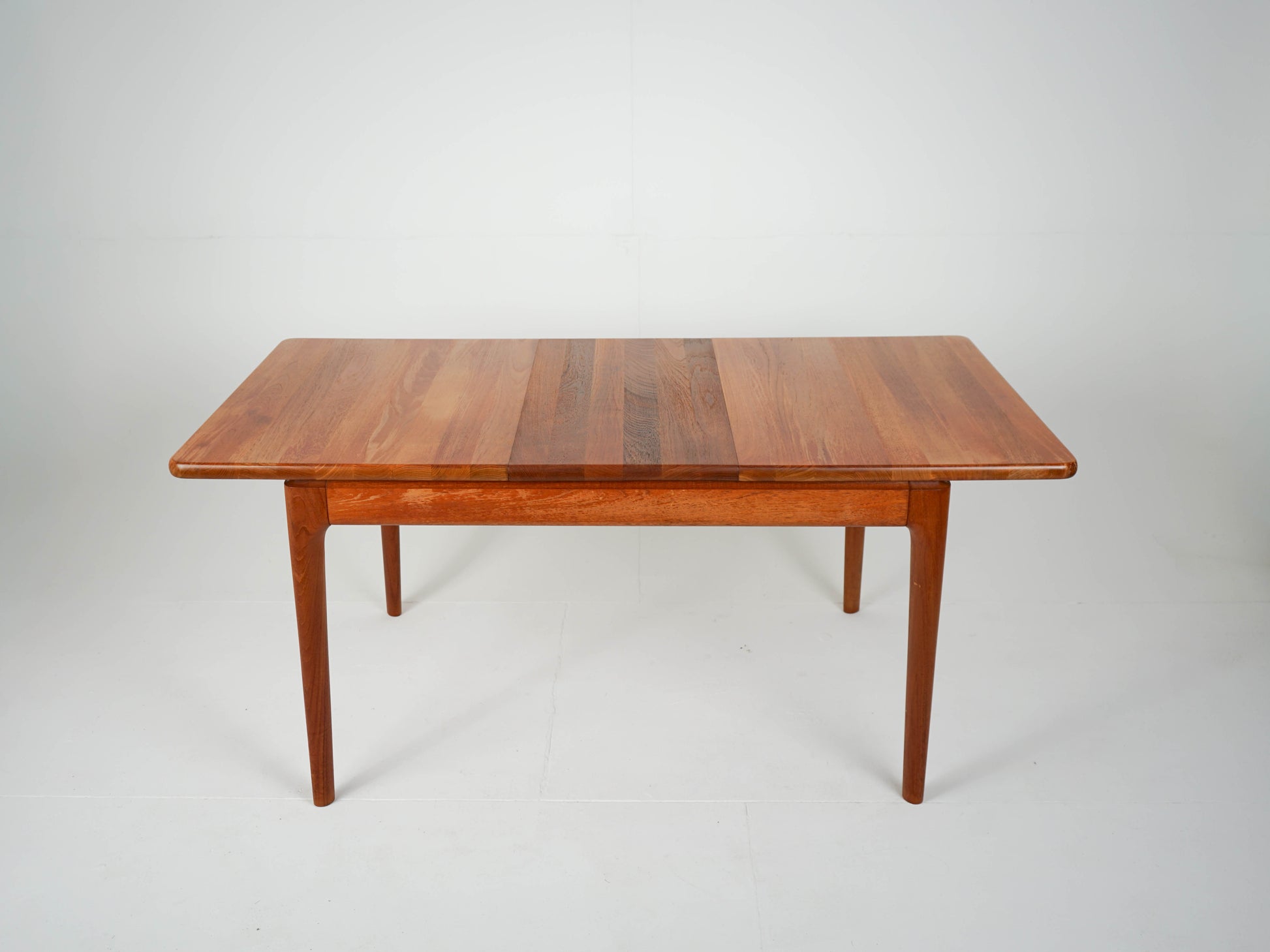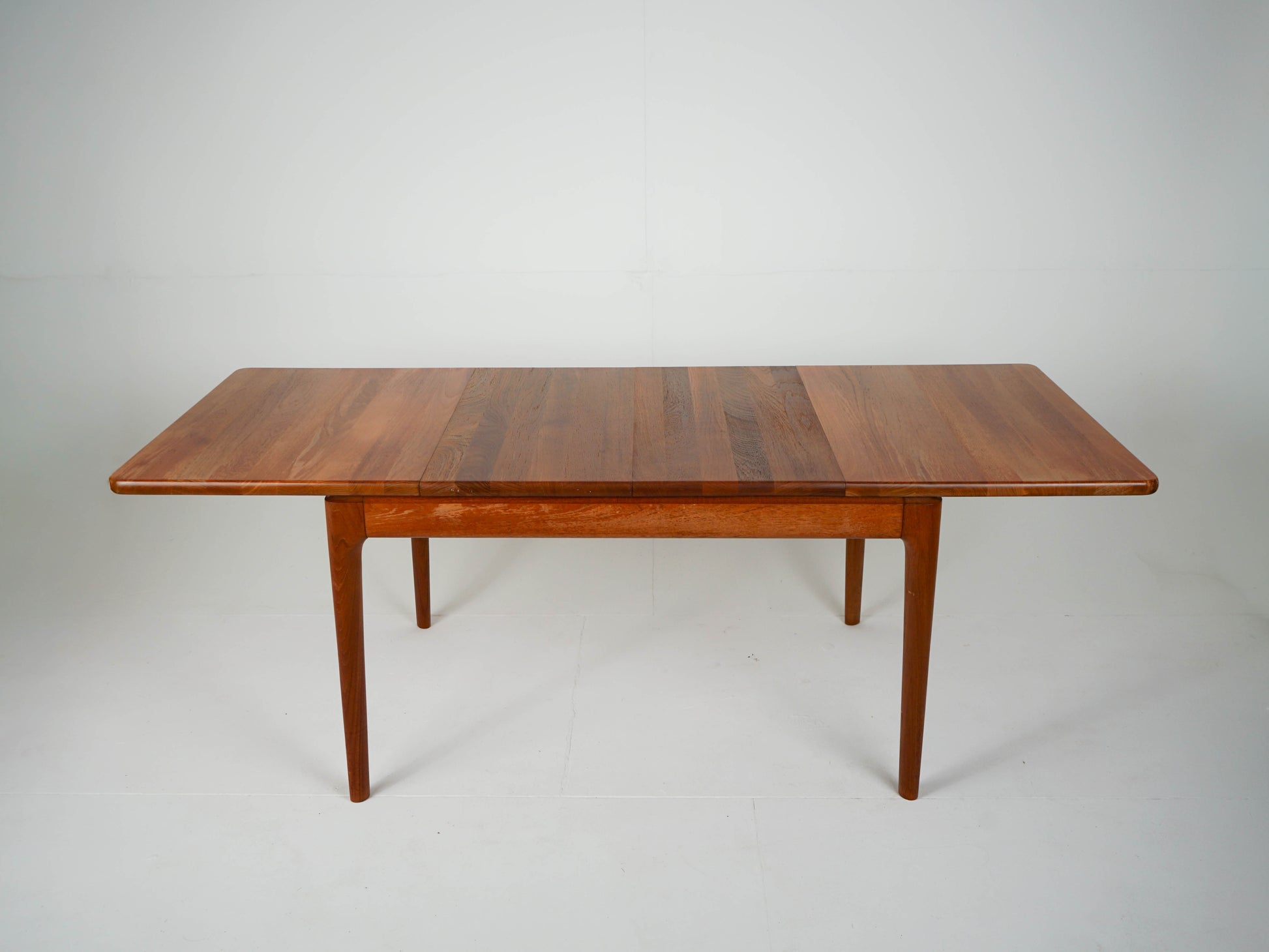 Zum Verkauf steht ein wunderschöner Vintage Teak Esstisch mit zwei Verlängerungen die im Tisch gelagert werden können.