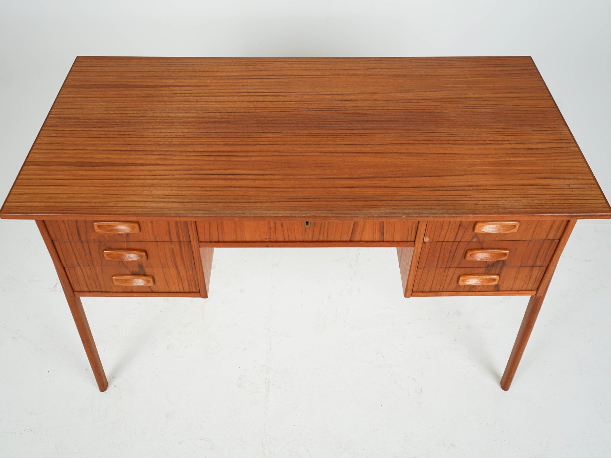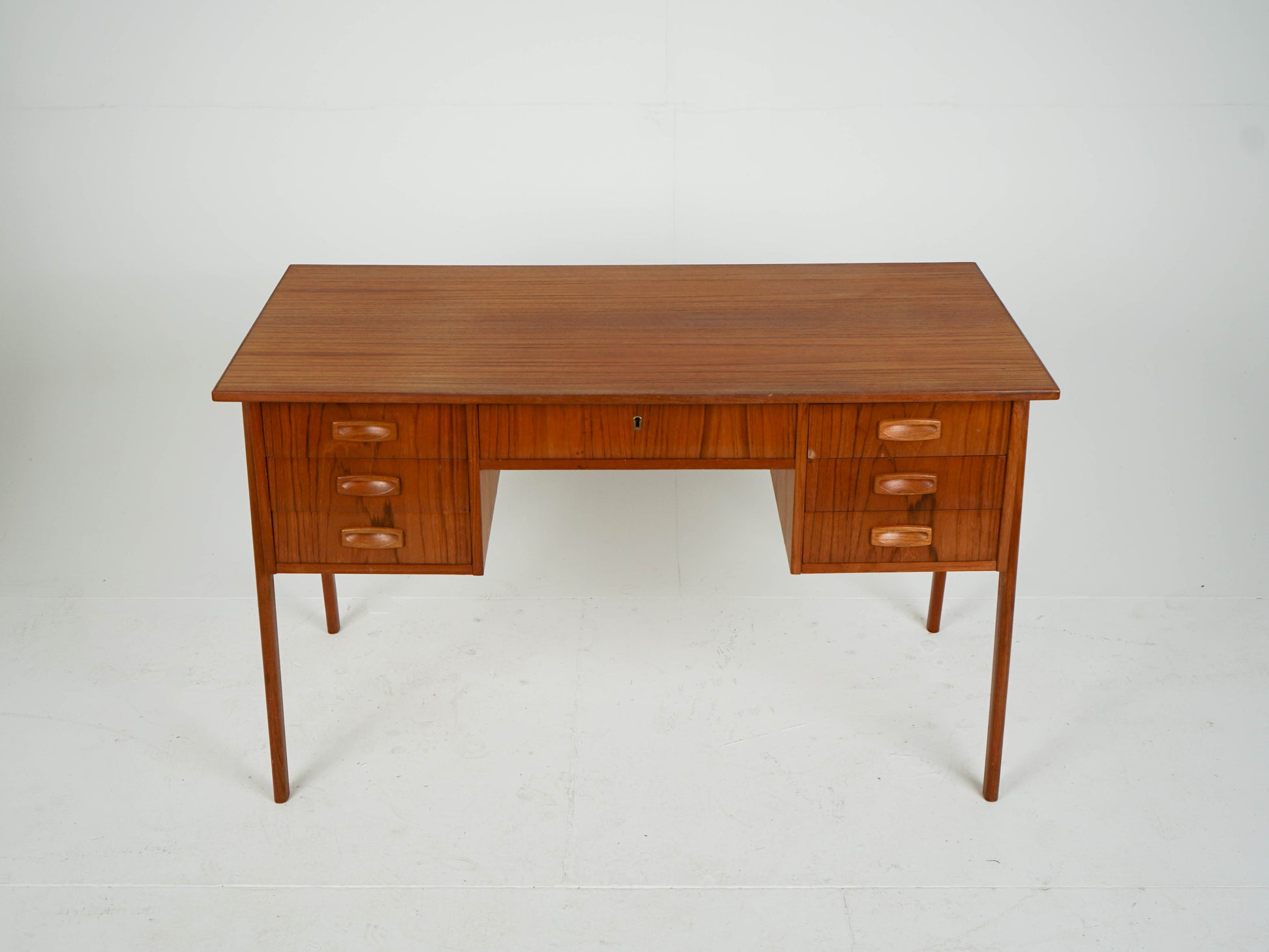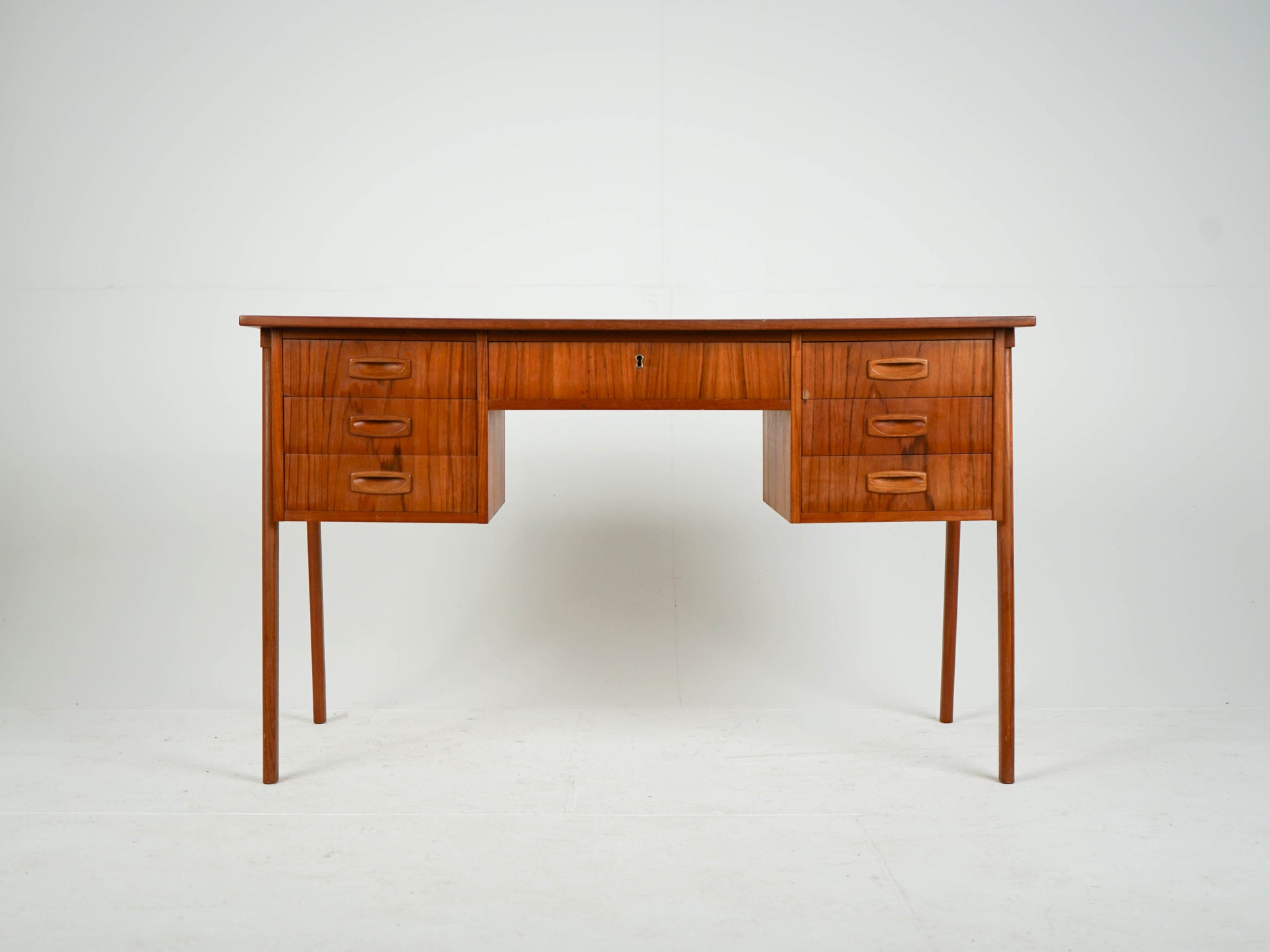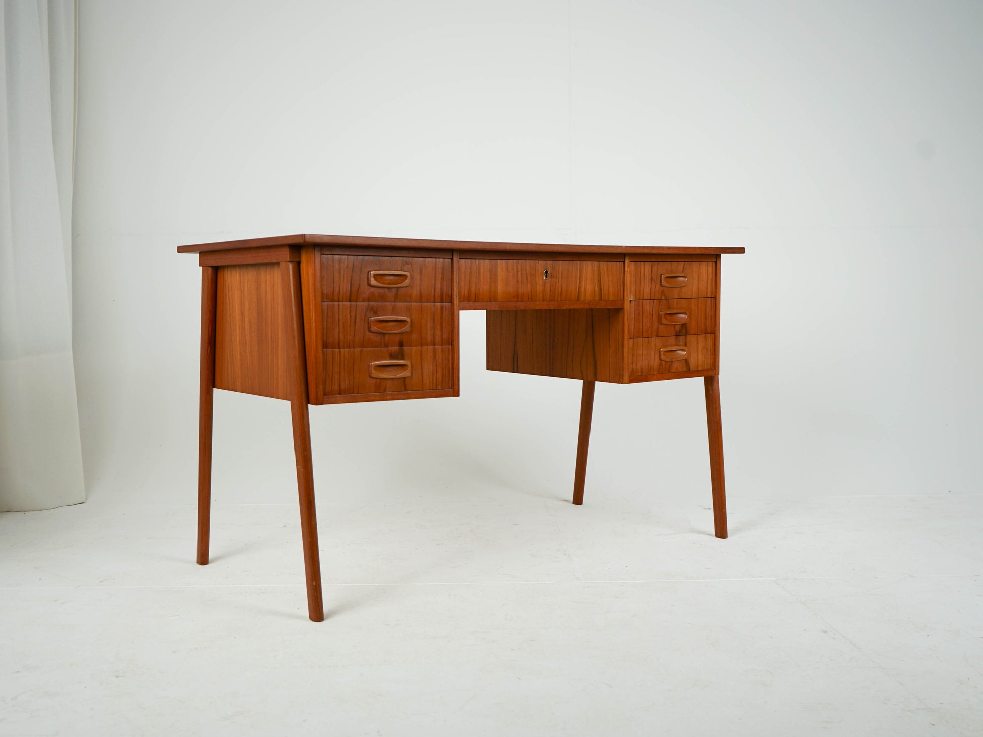 Zum Verkauf steht ein wunderschöner Vintage Teak Schreibtisch mit sechs kleinen und einer großen abschließbaren Schublade.